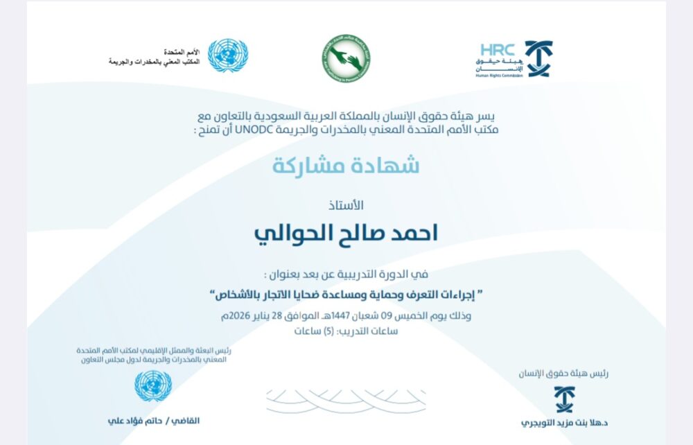 منحت هيئة حقوق الانسان في السعودية بالتعاون مع مكتب الامم المتحدة شهادة للأستاذ أحمد بن صالح بن هزاع في ( إجراءات التعرف وحماية ومساعدة ضحايا الاتجار بالبشر ) وتأتي هذه الشهادة تعزيزاً ومعرفه للعمل الذي يقوم به الأستاذ أحمد في الإدارة القانونية في إدارة التعليم بالباحه.